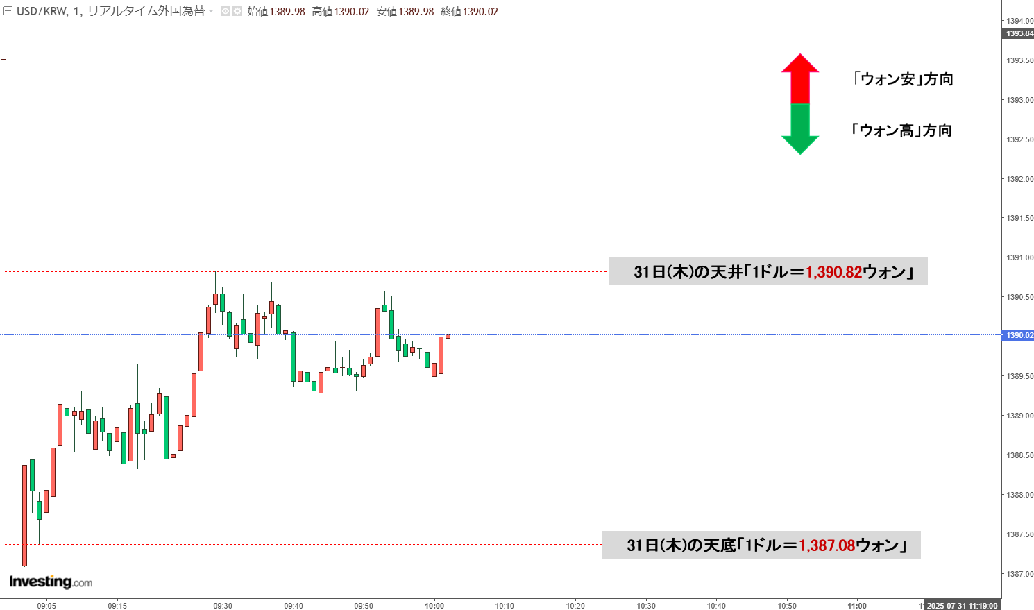 2025年07月31日(木)の市場が開きました。10:00現在、ドルウォンのチャートは以下のようになっています(チャートは『Investing.com』より引用)。