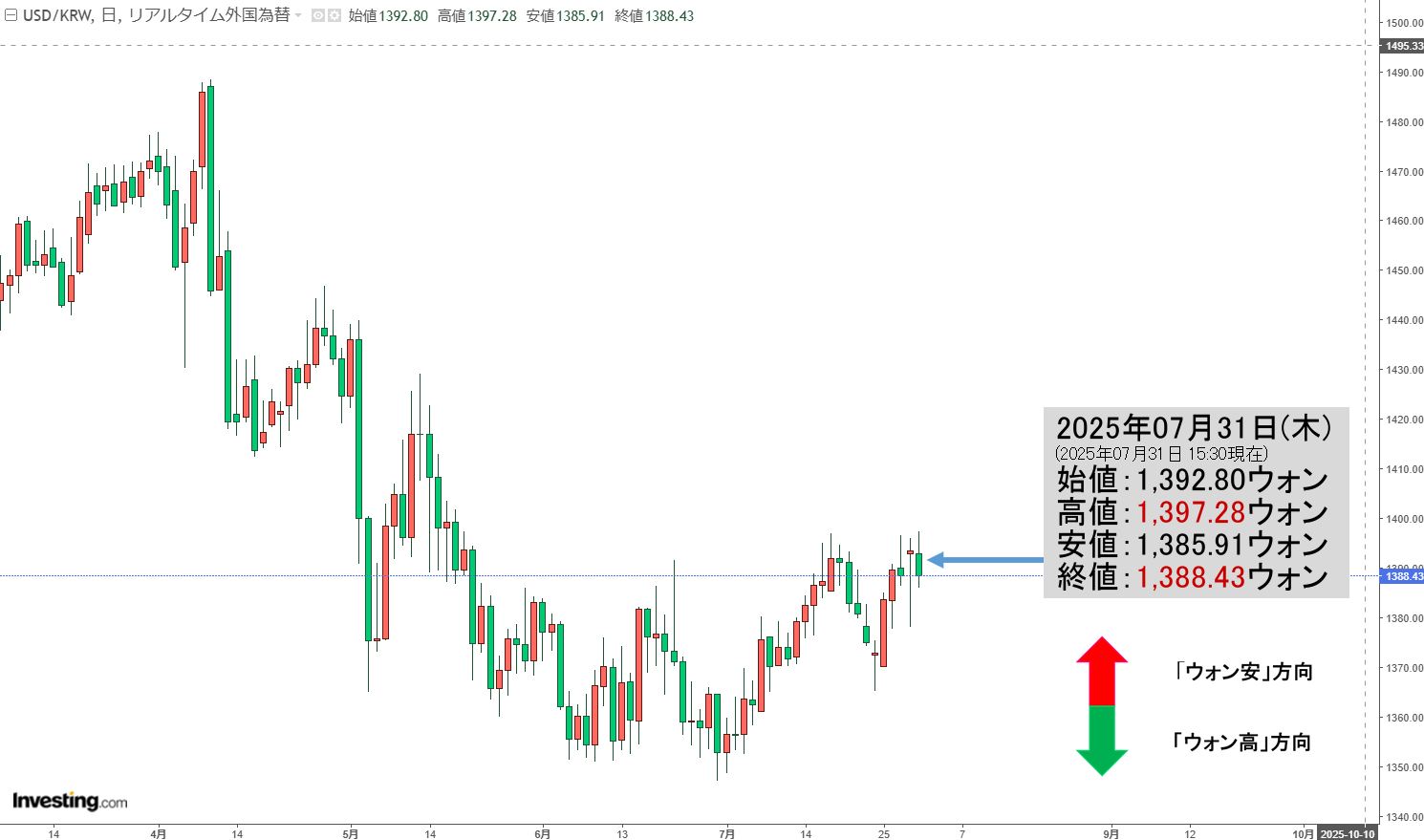 2025年07月31日(木)15:30現在、ドルウォンのチャートは以下のようになっています(チャートは『Investing.com』より引用)。