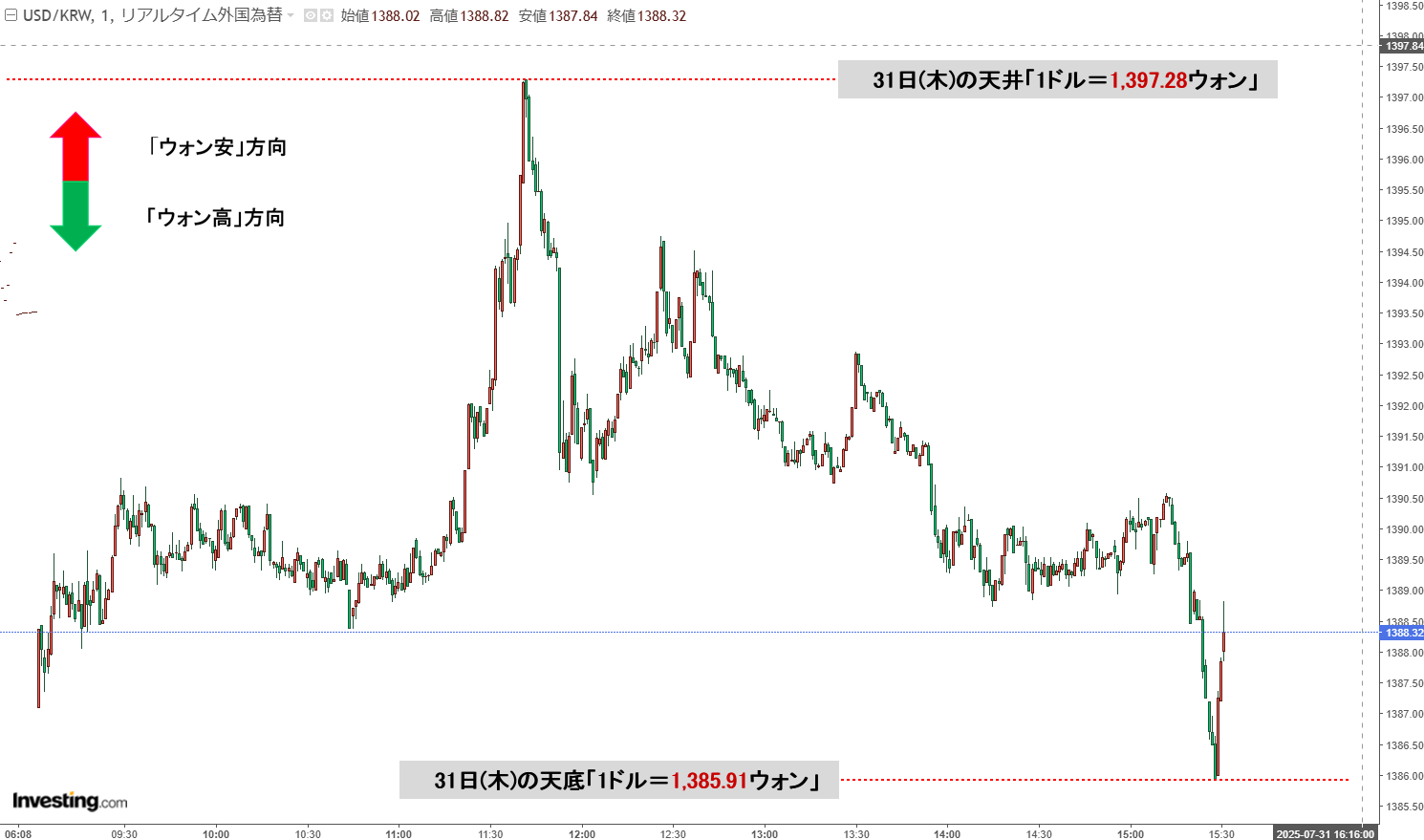 「ドルウォン」31日(木)夕刻・「1,388ウォン」陰線。