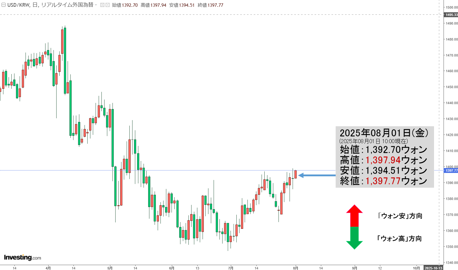 2025年08月01日(金)の市場が開きました。10:00現在、ドルウォンのチャートは以下のようになっています(チャートは『Investing.com』より引用)。