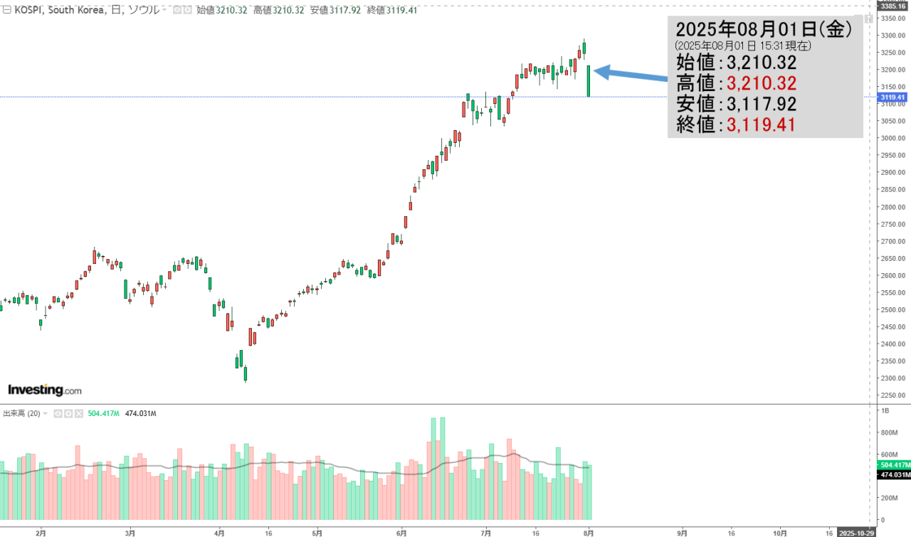 2025年08月01日(金)の韓国株式市場が締まりました。15:31現在、KOSPI(韓国総合株価指数)のチャートは以下のようになっています(チャートは『Investing.com』より引用)。