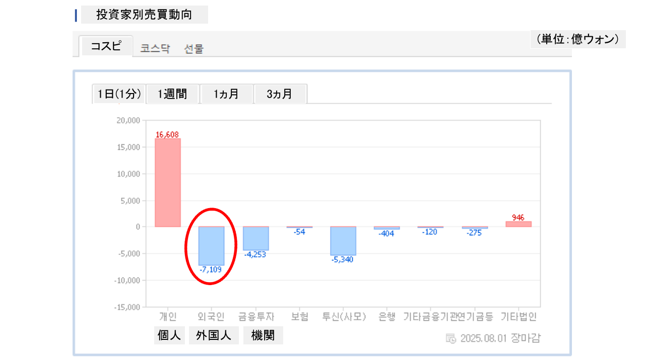 個人投資家は「1兆6,608億ウォン」の買い越し。一方の外国人投資家は「7,109億ウォン」の売り越しです。