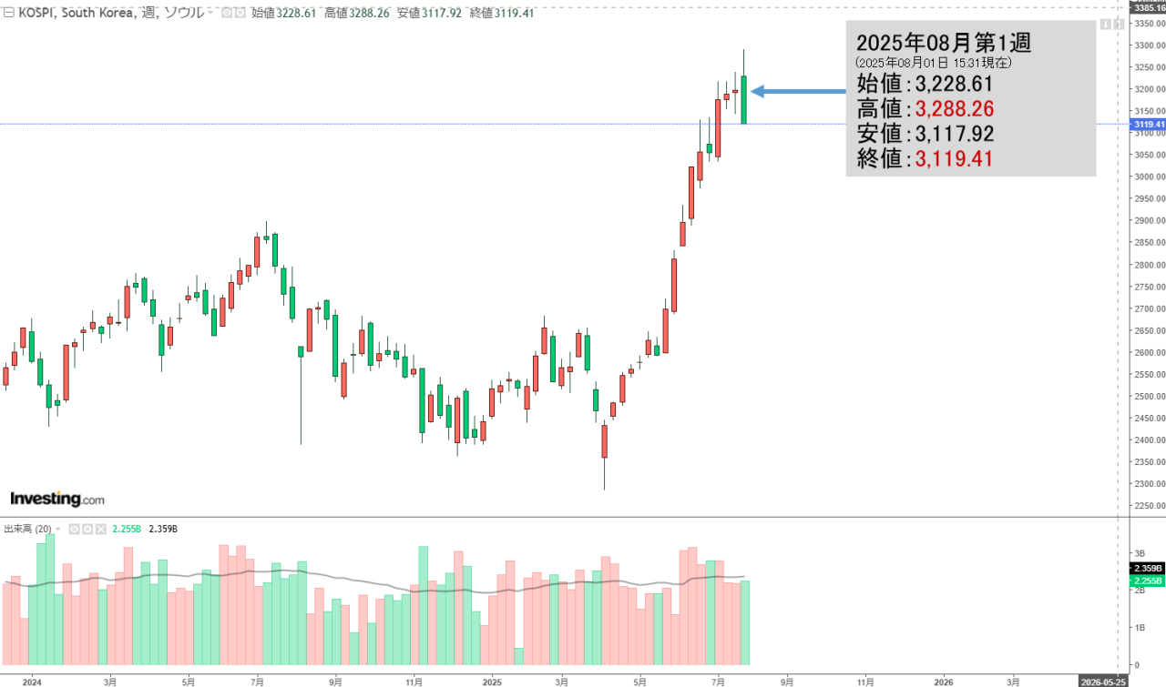 「韓国株式市場」08月04日(月)初動・KOSPI「3,140」下げ始まりで陽線。
