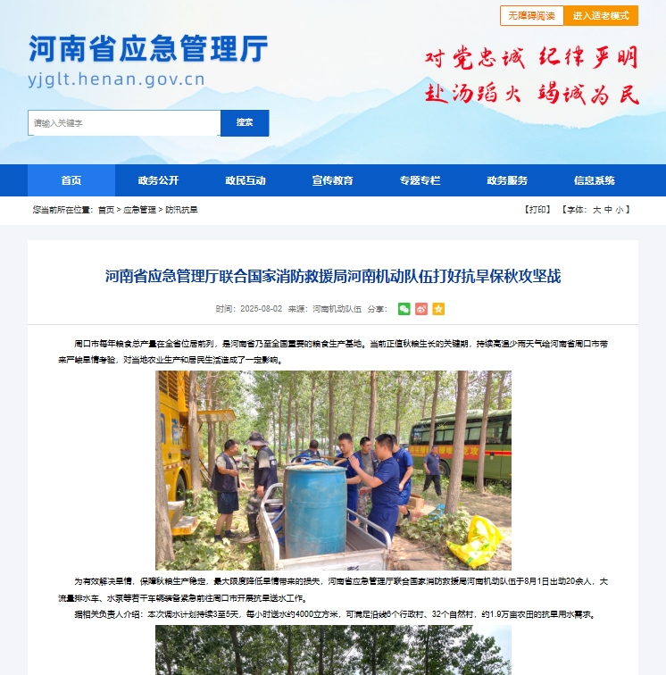 河南省応急管理庁、国家消防救援局河南機動隊と連携し、干ばつ対策と秋作物保護の総力戦を展開