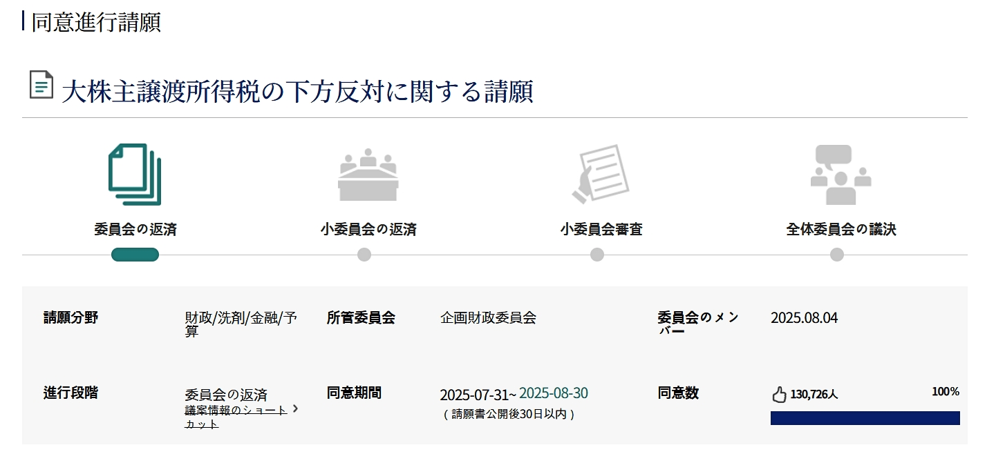 大株主要件の強化に反対する国会電子請願は、2025年07月31日に上がりましたが、08月04日時点で13万人も賛同を集めています。