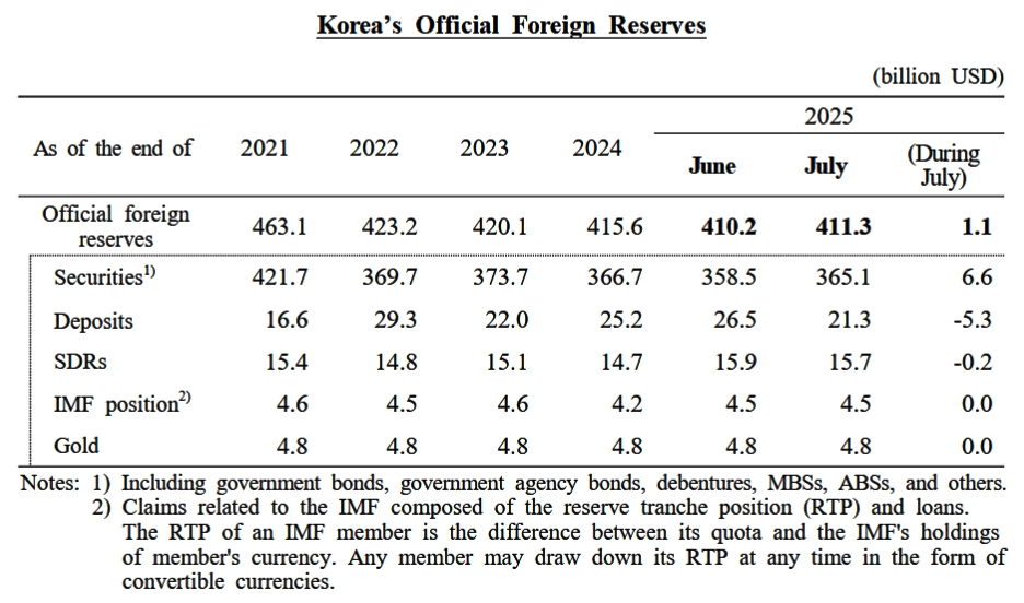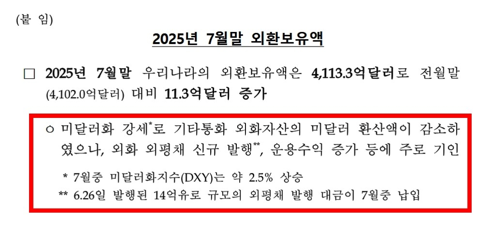 ** 06月26日に発行された14億ドル規模の外貨建て債券の発行代金が07月中に入金⇒参照・引用元:『韓国銀行』公式サイト「2025년 7월말 외환보유액」