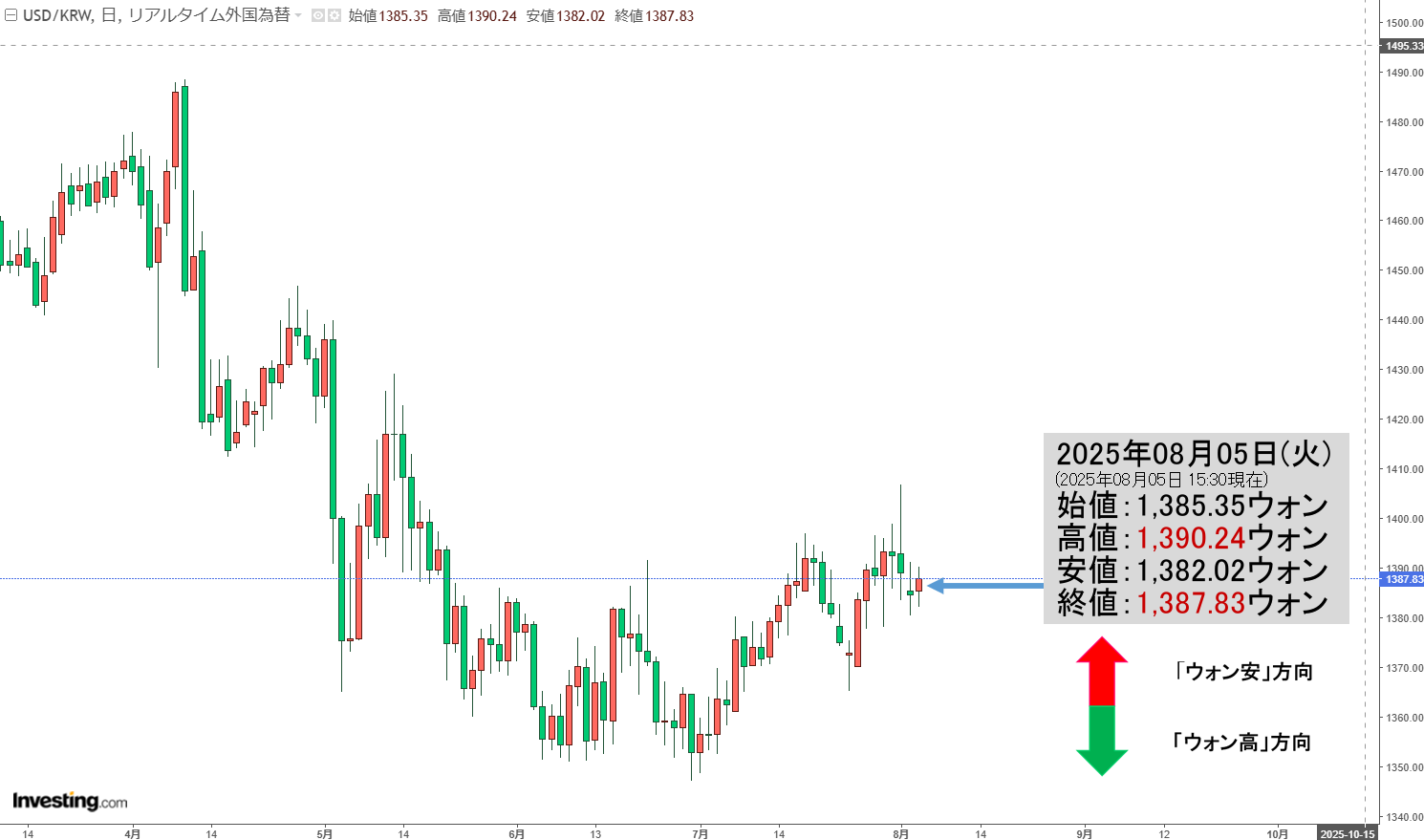 2025年08月05日(火)15:30現在、ドルウォンのチャートは以下のようになっています(チャートは『Investing.com』より引用)。