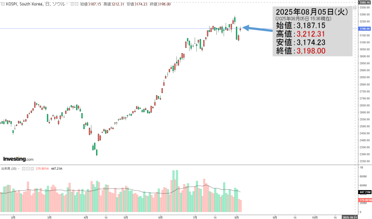 「韓国株式市場」08月06日(水)初動・KOSPI「3,184」