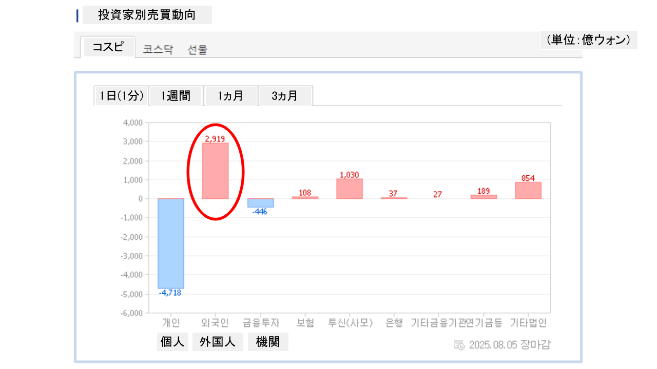 個人投資家は「4,718億ウォン」の売り越し。一方の外国人投資家は「2,919億ウォン」の買い越しです。