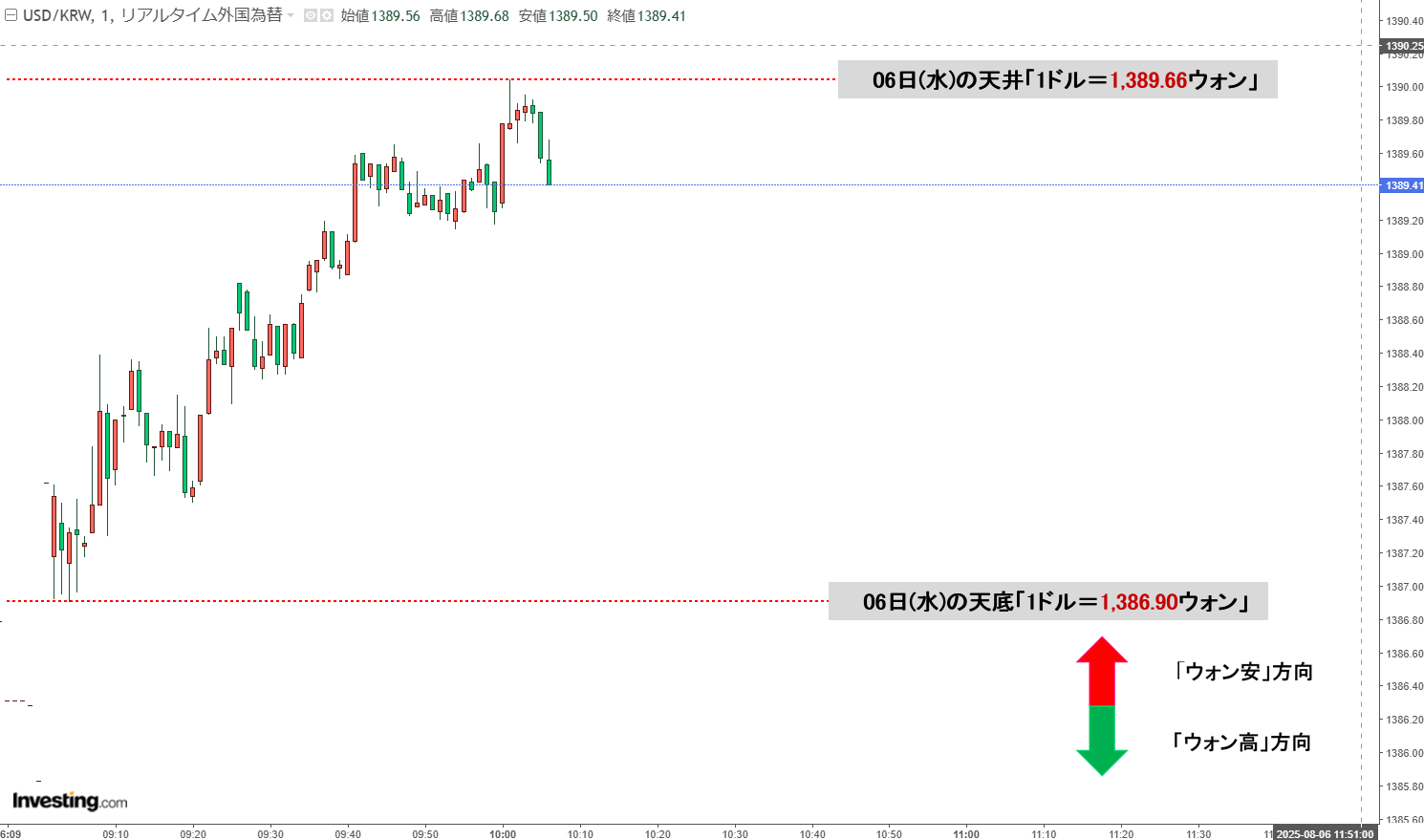 「ドルウォン」08月06日(水)初動・「1,389ウォン」