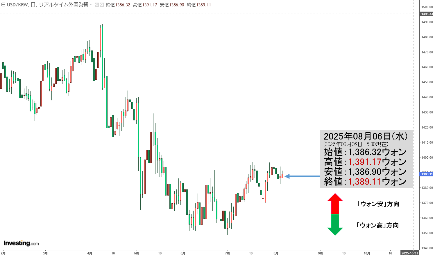 2025年08月06日(水)15:30現在、ドルウォンのチャートは以下のようになっています(チャートは『Investing.com』より引用)。
