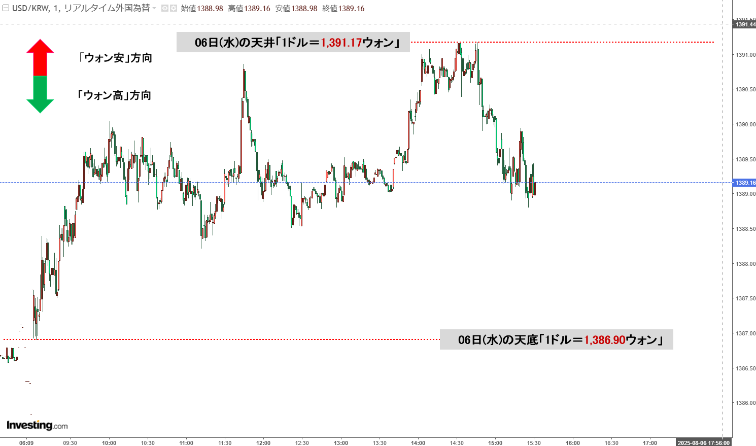 「ドルウォン」08月07日(木)初動・「1,387ウォン」上が重い。