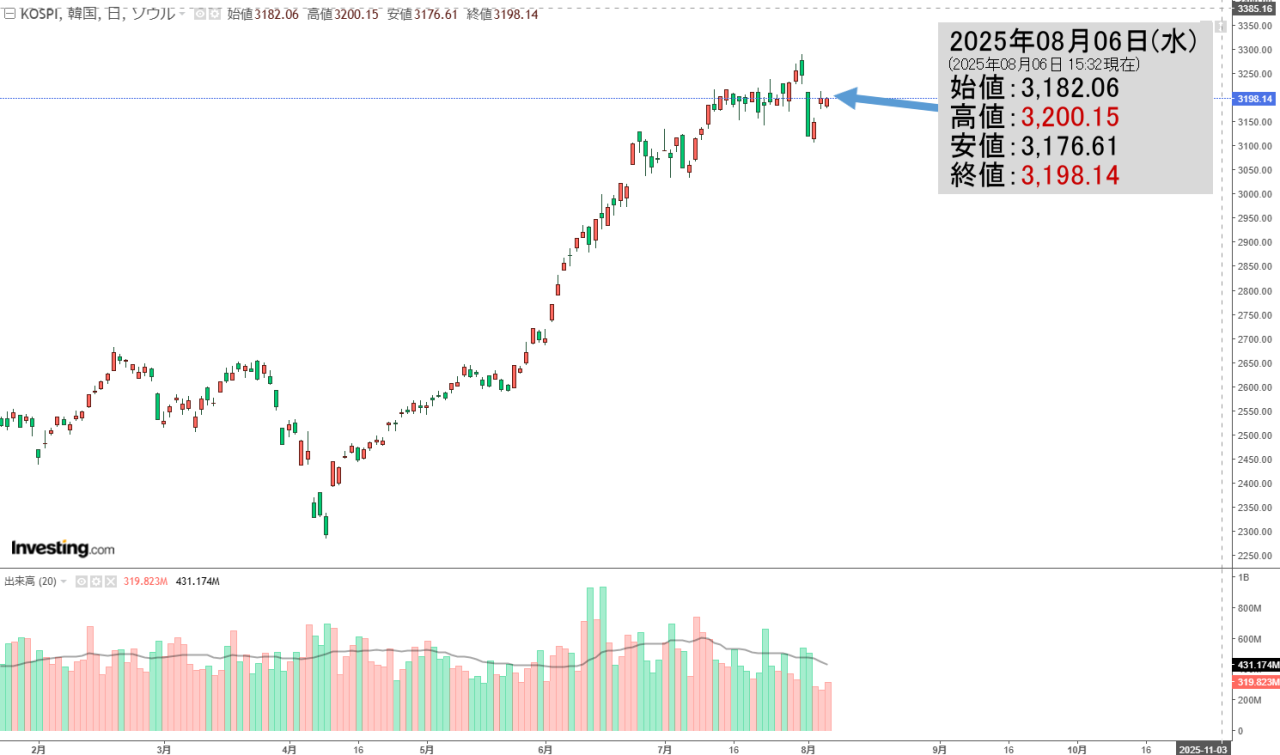 「韓国株式市場」08月07日(木)初動・KOSPI「3,213」ちょい上げ。
