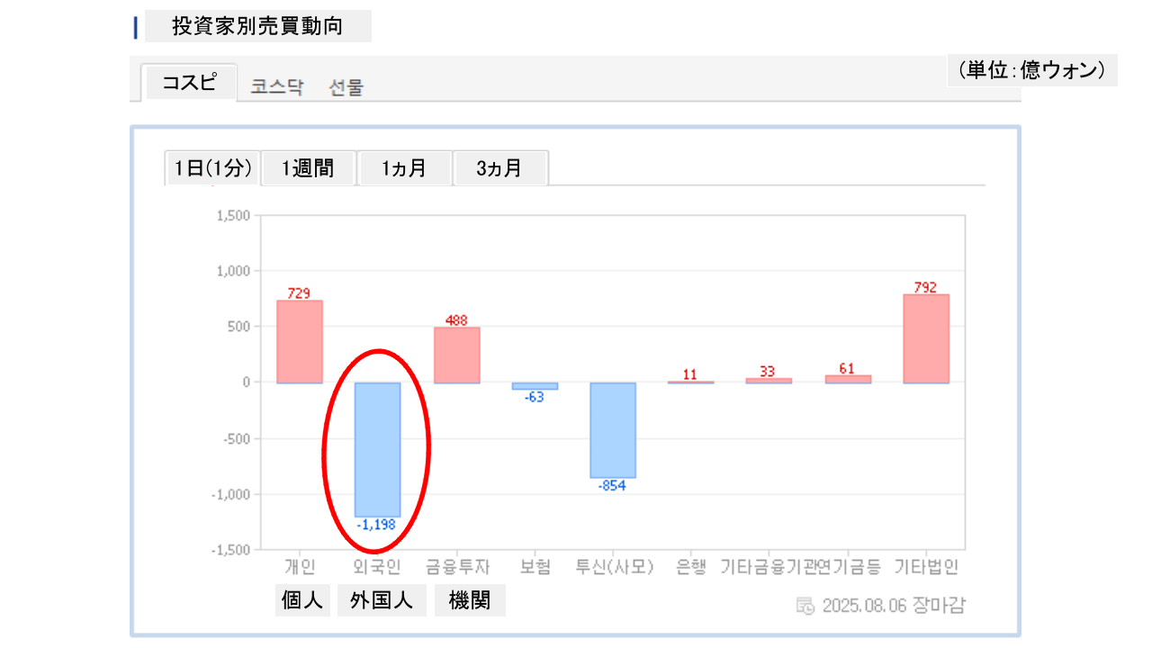 個人投資家は「729億ウォン」の買い越し。一方の外国人投資家は「1,198億ウォン」の売り越しです。