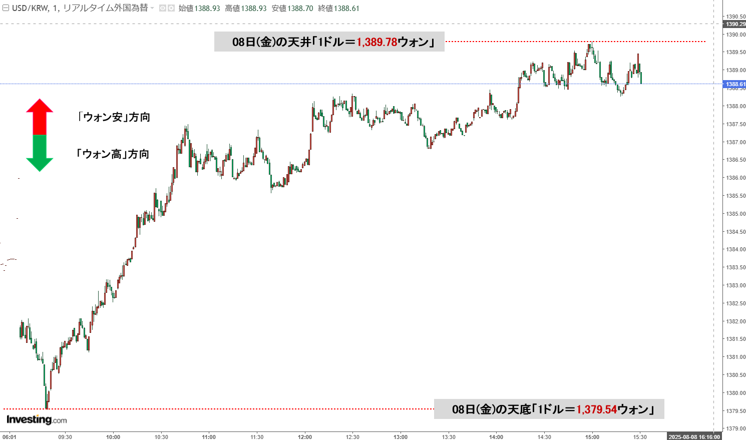 2025年08月08日(金)が(ほぼほぼ)締まりました。2025年08月09日 08:28現在、ドルウォンチャートは以下のようになっています(チャートは『Investing.com』より引用:以下同)。ローソク足1本が1分間の値動きを示す「...