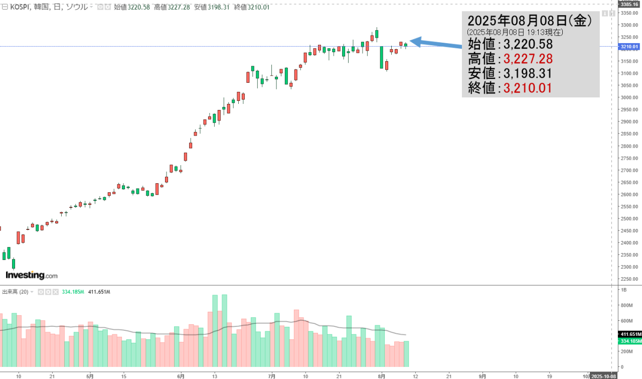 2025年08月08日(金)の韓国株式市場が締まりました。19:13現在、KOSPI(韓国総合株価指数)のチャートは以下のようになっています(チャートは『Investing.com』より引用)。
