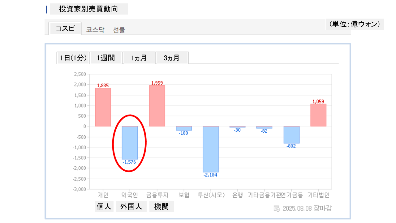 個人投資家は「1,835億ウォン」の買い越し。一方の外国人投資家は「1,576億ウォン」の売り越しです。