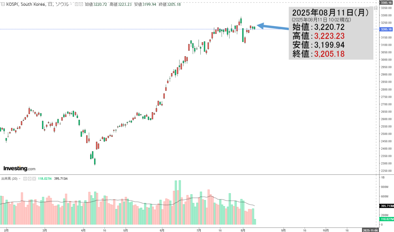 2025年08月11日(月)の韓国株式市場が締まりました。15:32現在、KOSPI(韓国総合株価指数)のチャートは以下のようになっています(チャートは『Investing.com』より引用)。陰線が伸びましたが、なんとか「3,200」を割...