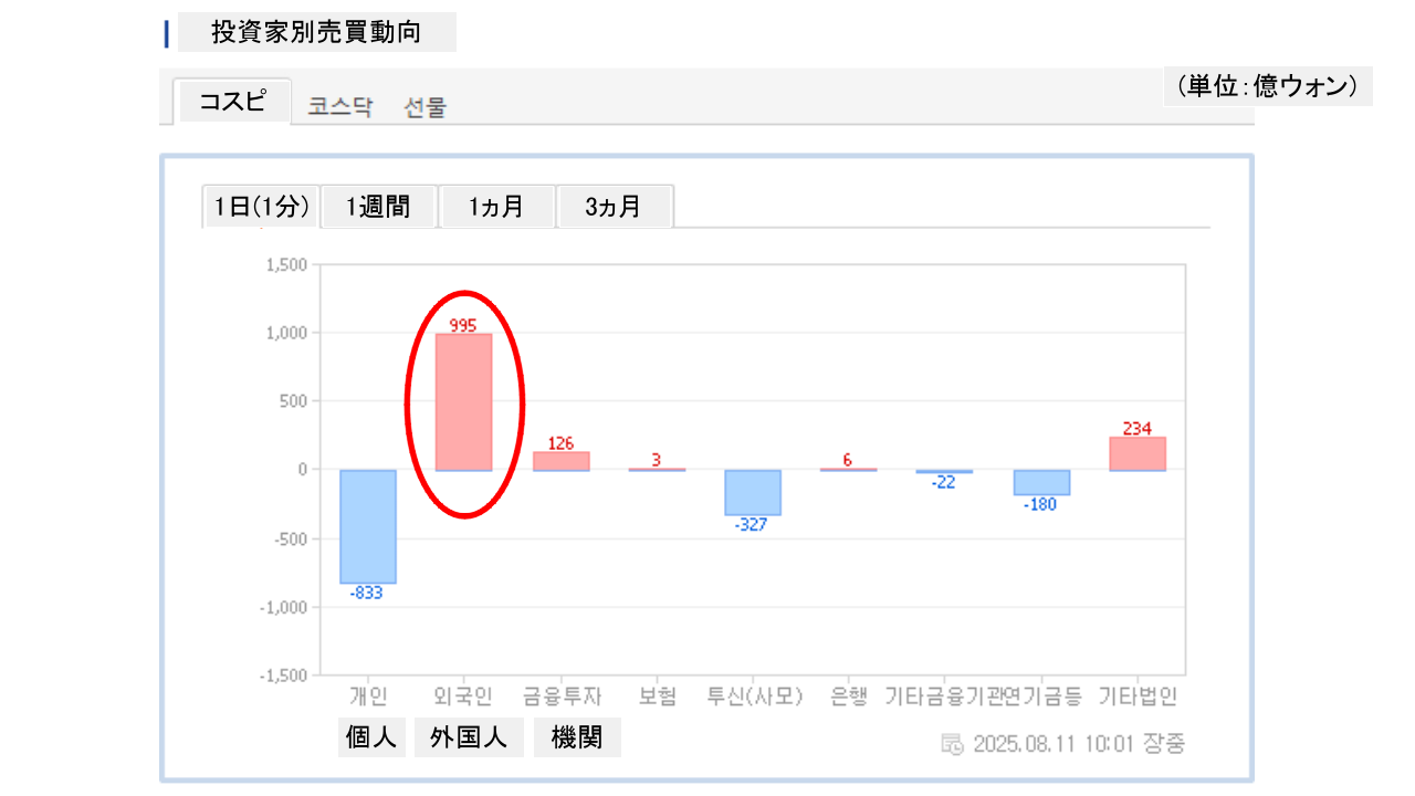 個人投資家は「833億ウォン」の売り越し。一方の外国人投資家は「995億ウォン」の買い越しです。