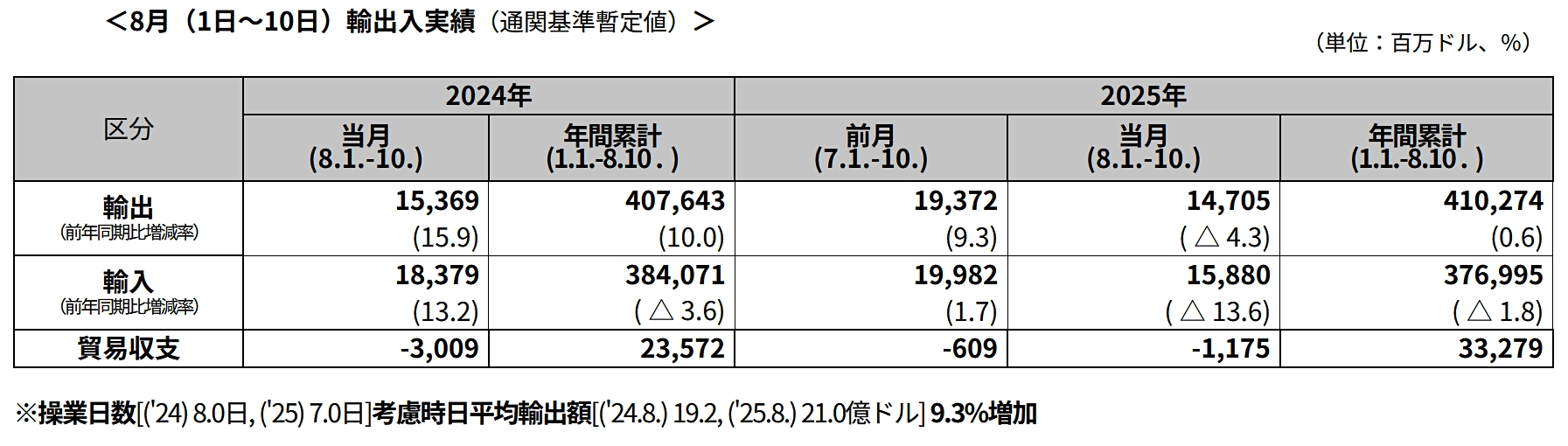 2025年08月11日、韓国の関税庁が「2025年08月01~10日の輸出入状況」のデータを公表しました。以下です。