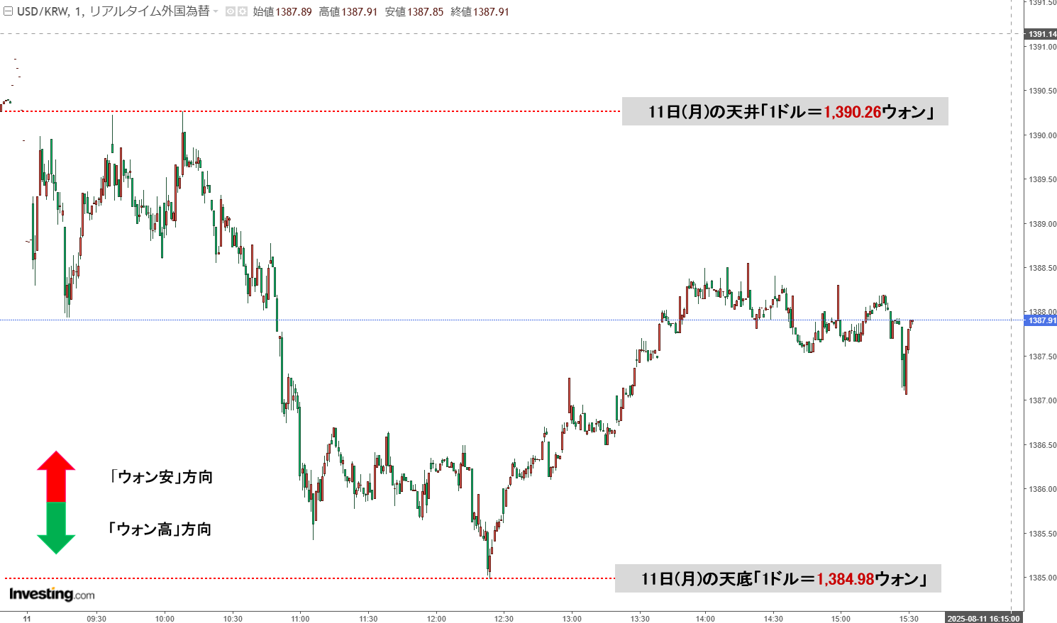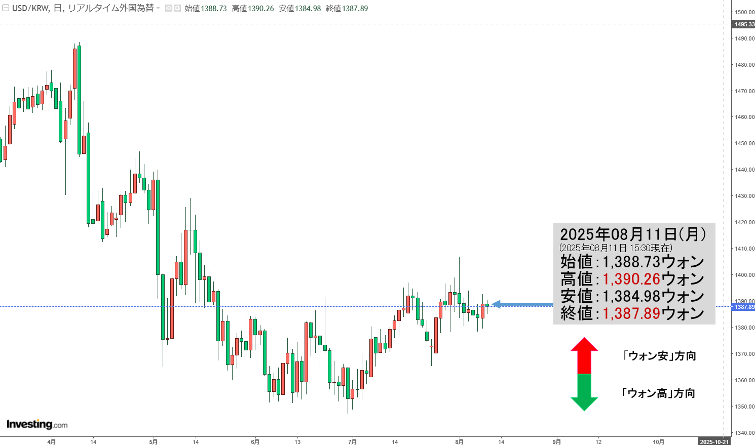 2025年08月12日(火)の市場が開きました。10:00現在、ドルウォンのチャートは以下のようになっています(チャートは『Investing.com』より引用)。前日はコマ足になってしまいましたが、本日は現在のところ陽線。「1ドル=1,3...