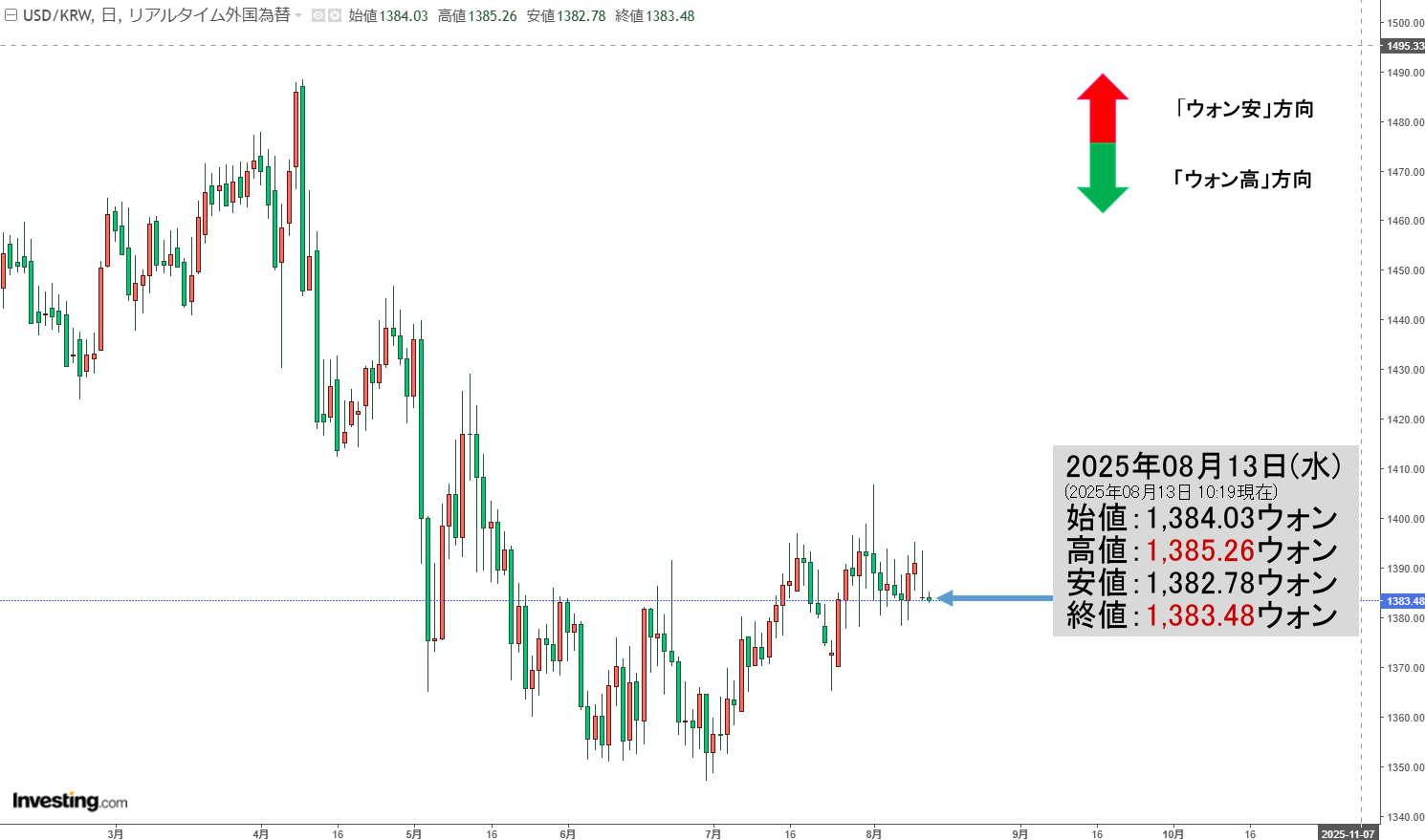 2025年08月13日(水)15:30現在、ドルウォンのチャートは以下のようになっています(チャートは『Investing.com』より引用)。陰線が伸びました。現在のところ「1ドル=1,381ウォン」近辺の攻防となっています。「1ドル=1...