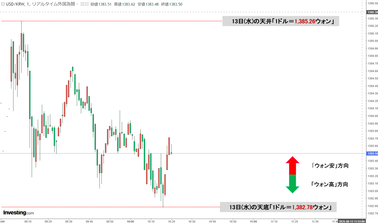 2025年08月13日(水)の市場が開きました。10:19現在、ドルウォンのチャートは以下のようになっています(チャートは『Investing.com』より引用)。