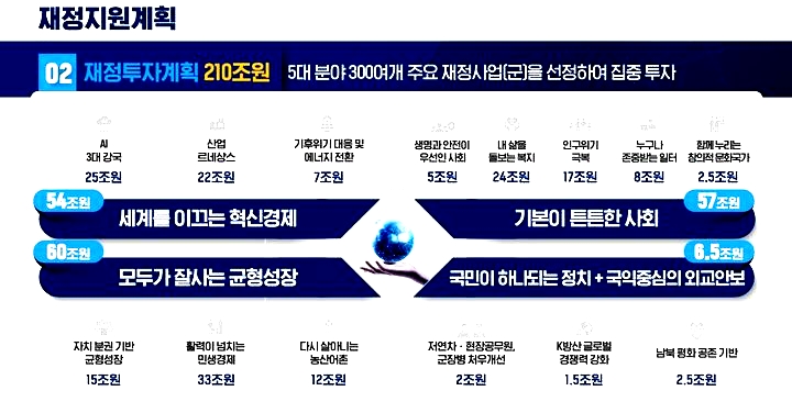 2025年08月13日、国政企画委員会は青瓦台迎賓館で国民報告大会を開き、2026年から2030年までの5年間で総額210兆ウォンの財政投資を行う――という方針を発表しました。