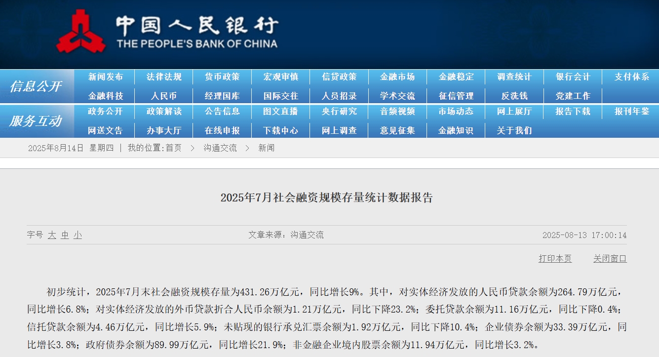 2025年08月13日、中国の中央銀行『中国人民銀行』が「2025年7月社会融资规模存量统计数据报告(2025年07月 社会融資規模残高統計データ報告)」を公表しました。