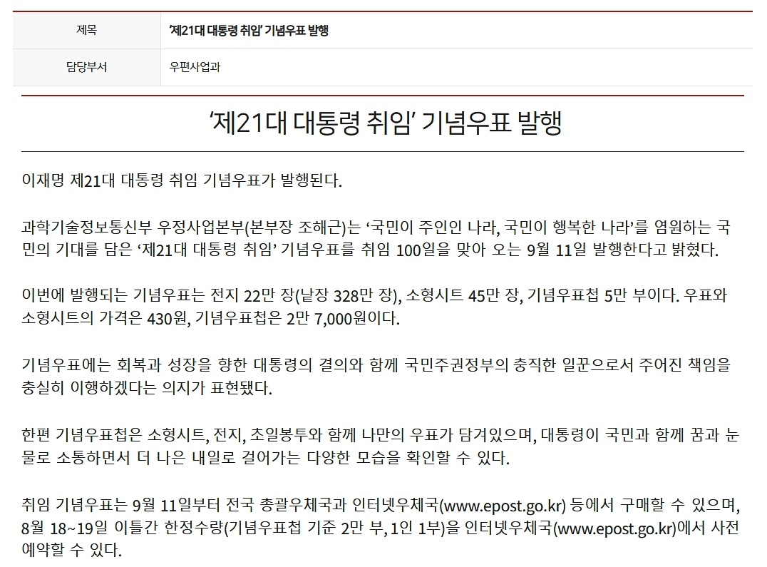 科学技術情報通信部 郵政事業本部(本部長:チョ・ヘグン)は、「国民が主人である国、国民が幸せな国」を願う国民の期待を込めた「第21代大統領就任」記念切手を就任100日を迎える来る09月11日に発行すると明らかにした。