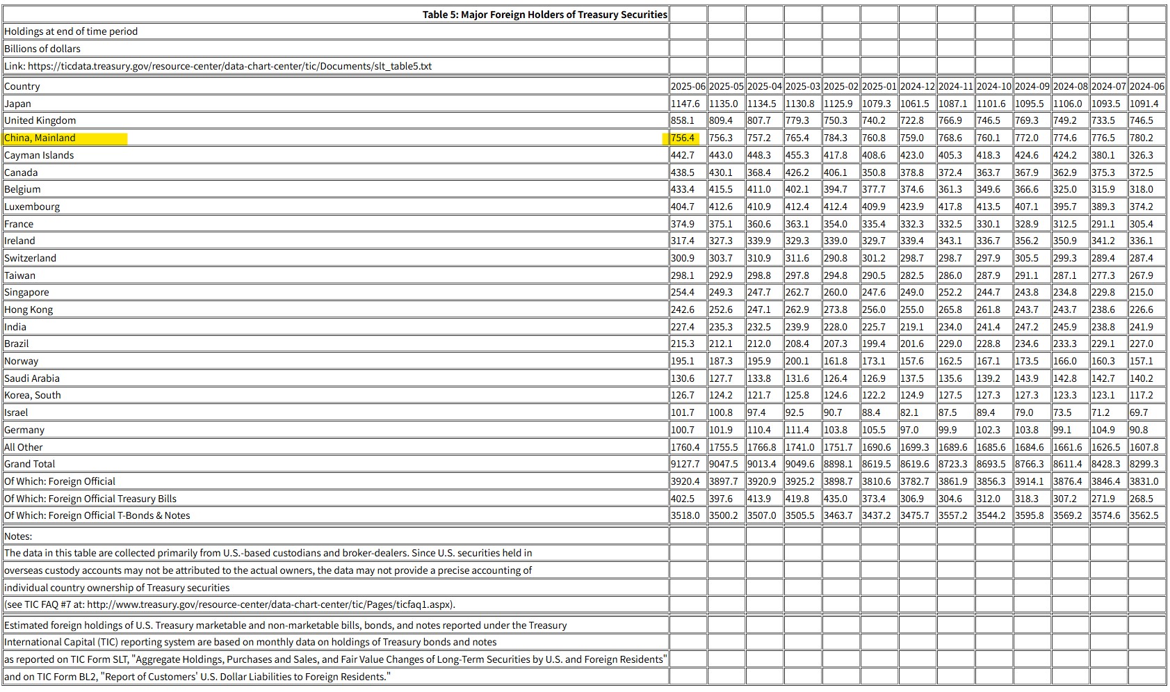 ⇒参照・引用元:『アメリカ合衆国 財務省』「Table 5: Major Foreign Holders of Treasury Securities」