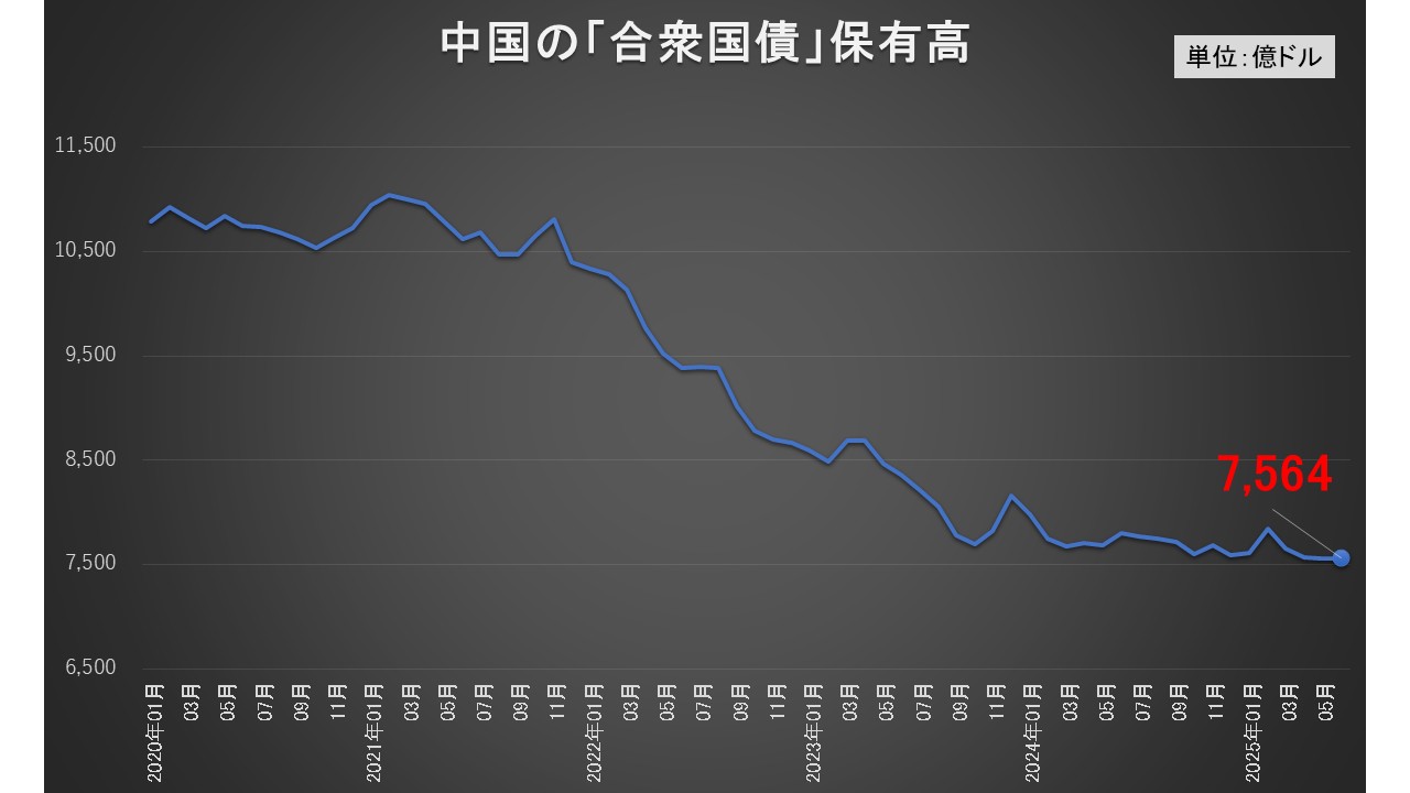 中国の合衆国公債保有額は、対前月比で「1億ドル」だけ増加し、2025年06月は「7,564億ドル」となりました。