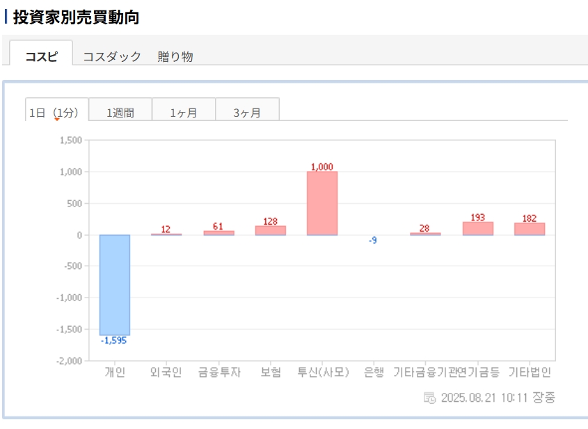 個人投資家は「1,595億ウォン」の売り越し。一方の外国人投資家は「12億ウォン」の買い越しです。