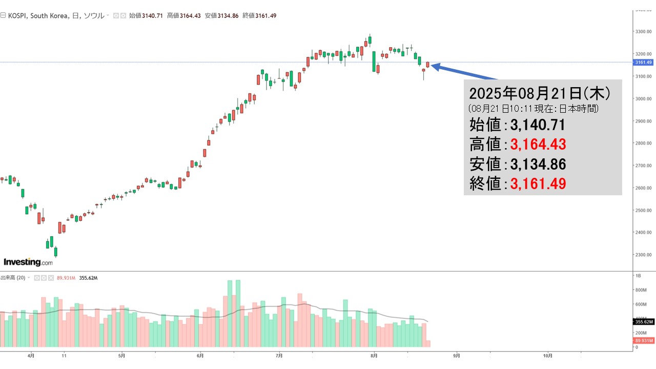 2025年08月21日(木)の韓国株式市場が開きました。10:11現在、KOSPI(韓国総合株価指数)のチャートは以下のようになっています(チャートは『Investing.com』より引用)。