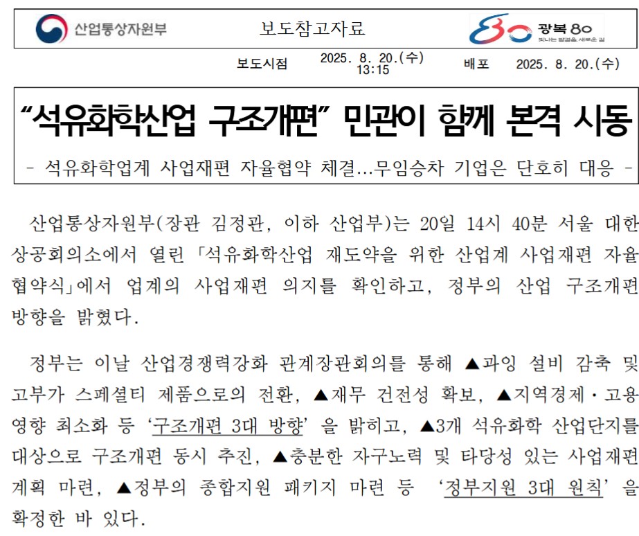 2025年08月20日、産業通商資源部は「石油化学産業再跳躍のための産業界事業再編自律協約式」を開催(以下がそのプレスリリース)。