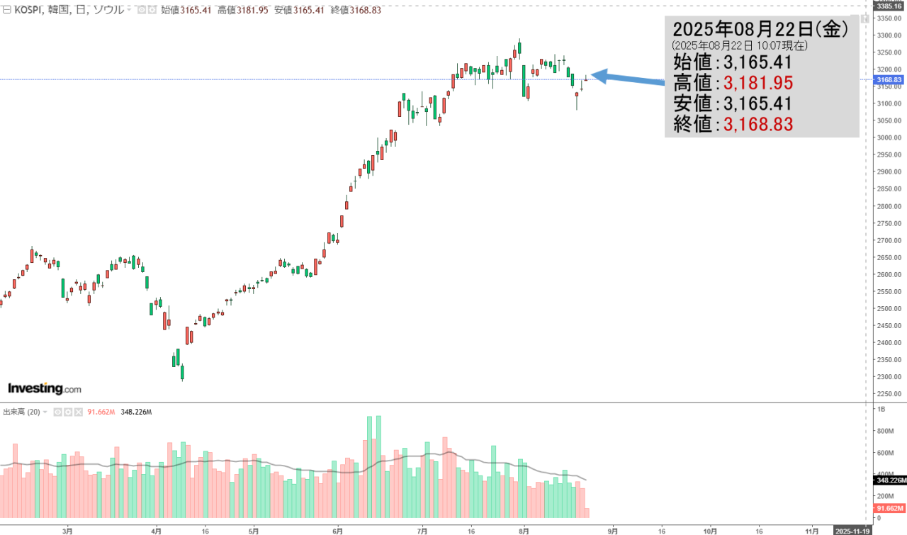 2025年08月22日(金)の韓国株式市場が締まりました。15:32現在、KOSPI(韓国総合株価指数)のチャートは以下のようになっています(チャートは『Investing.com』より引用)。ほとんど始値で終わりました。KOSPIは「3,...