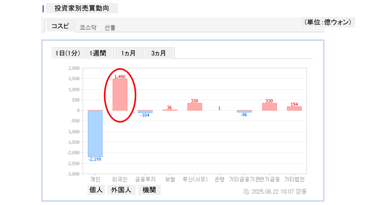 個人投資家は「2,199億ウォン」の売り越し。一方の外国人投資家は「1,490億ウォン」の買い越しです。