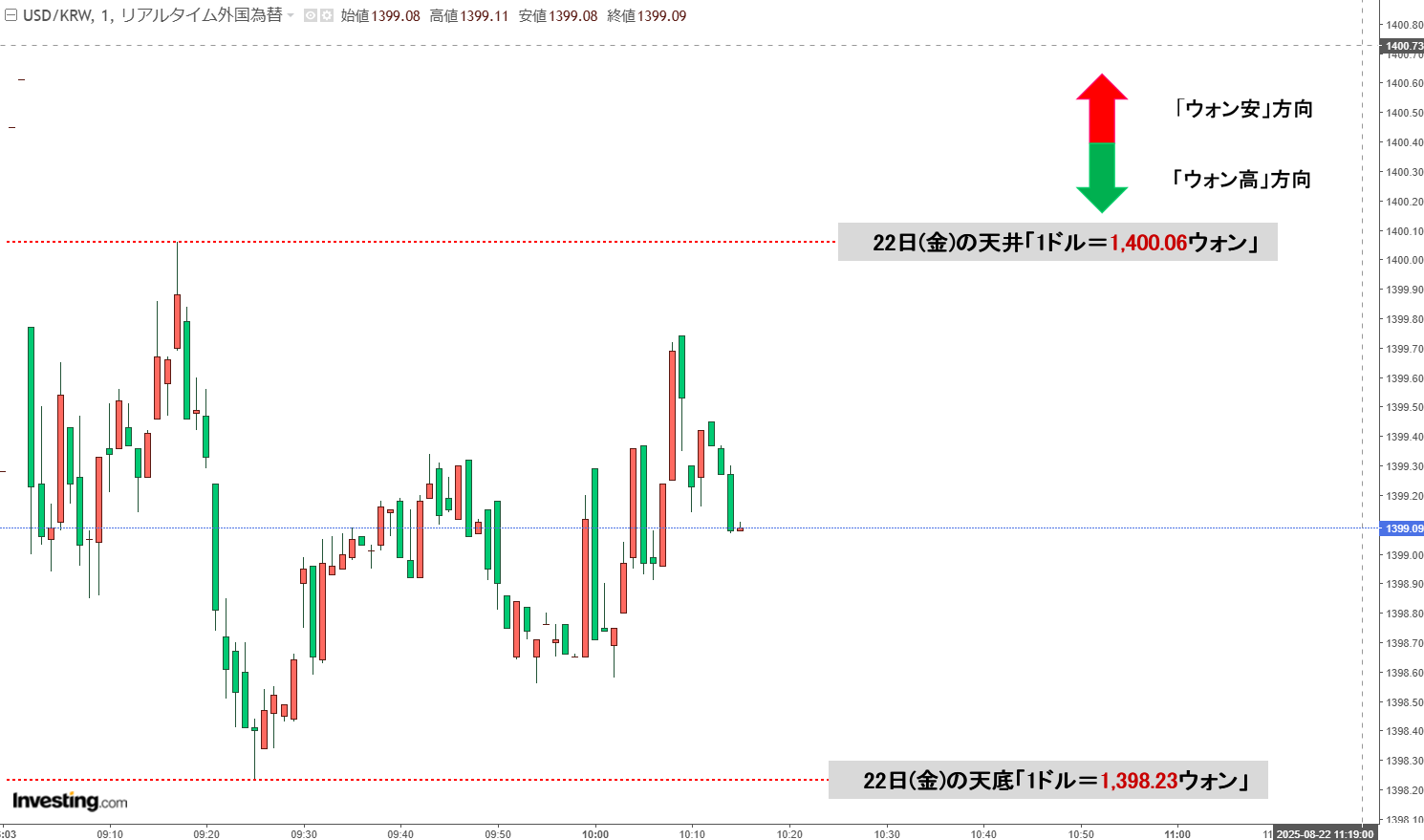 「ドルウォン」08月22日(金)初動・「1,399ウォン」1,400手前