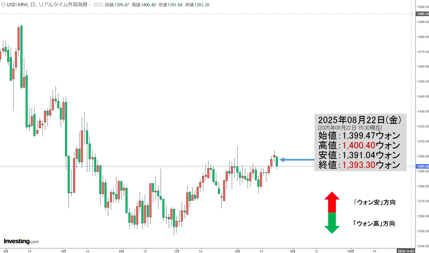 「1ドル=1,400ウォン」突破確定か?――だったのですが、残念ながら陰線が伸びました。