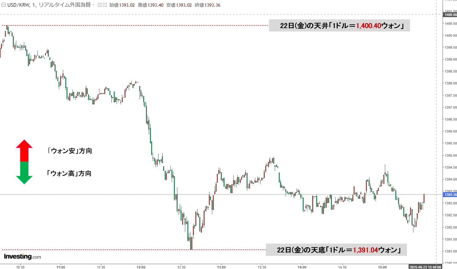 現在のところ「1ドル=1,393ウォン」近辺の攻防となっています。