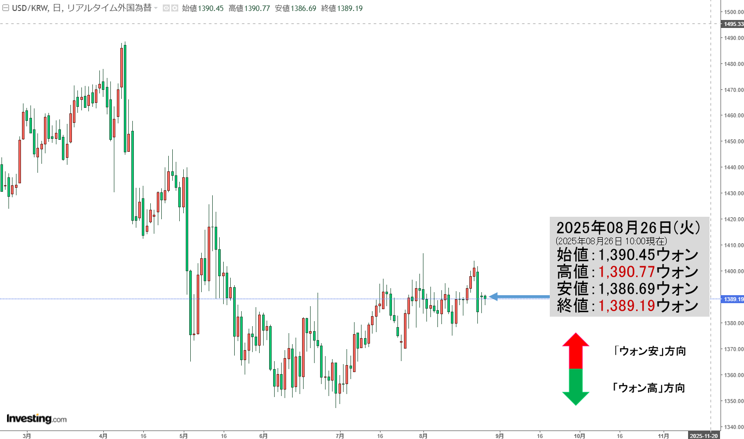 2025年08月26日(火)の市場が開きました。10:00現在、ドルウォンのチャートは以下のようになっています(チャートは『Investing.com』より引用)。