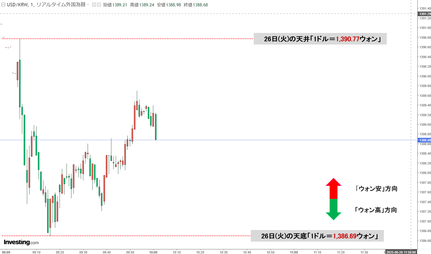 「ドルウォン」08月26日(火)初動・「1,389ウォン」1,390キリ番での攻防