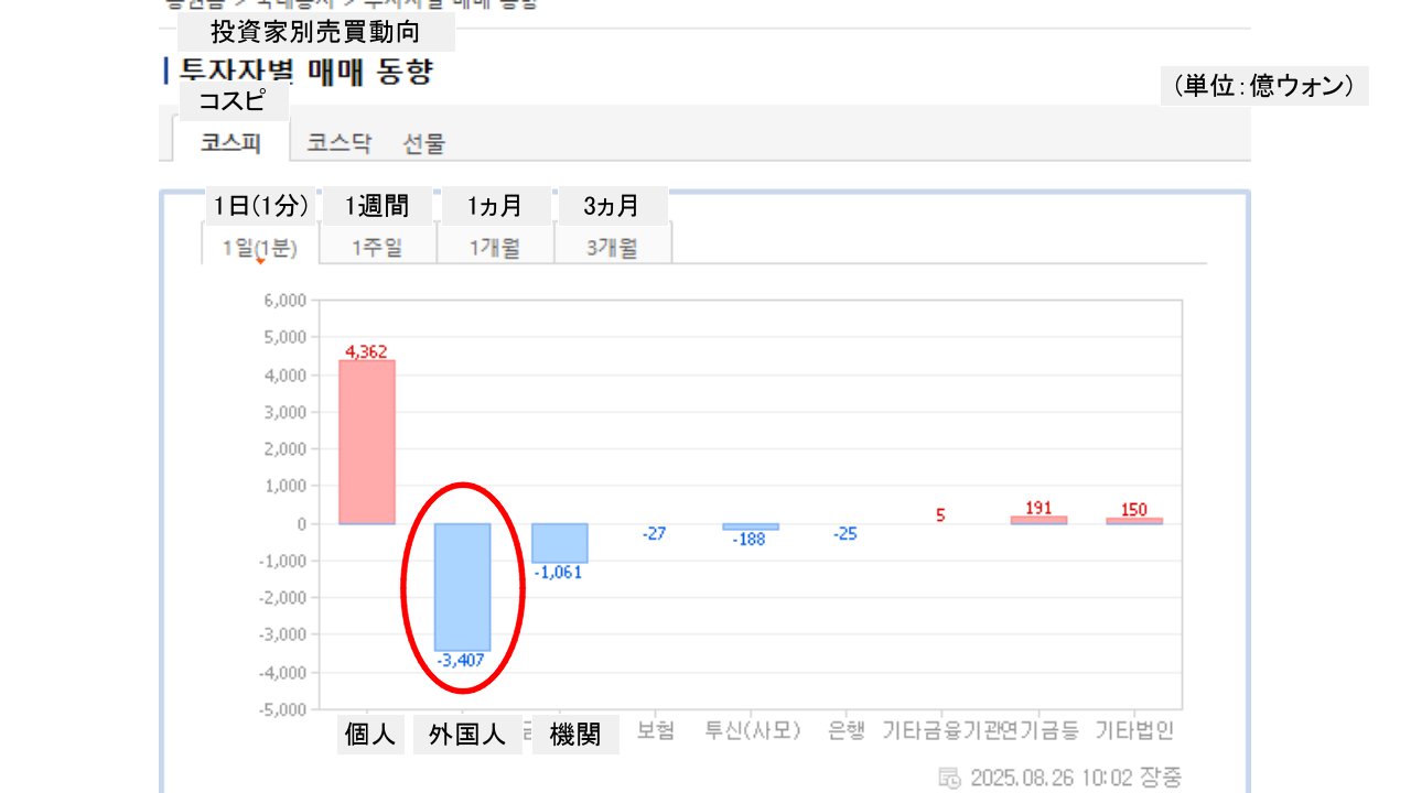 個人投資家は「4,362億ウォン」の買い越し。一方の外国人投資家は「3,407億ウォン」の売り越しです。