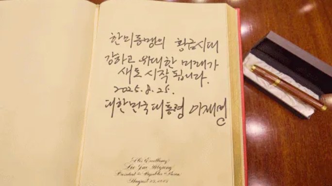 ↑李在明(イ・ジェミョン)さんのサイン。「韓米同盟の黄金時代 強く偉大な未来が 新たに始まります。2025年8月25日 大韓民国大統領 李在明」と書いてあります。