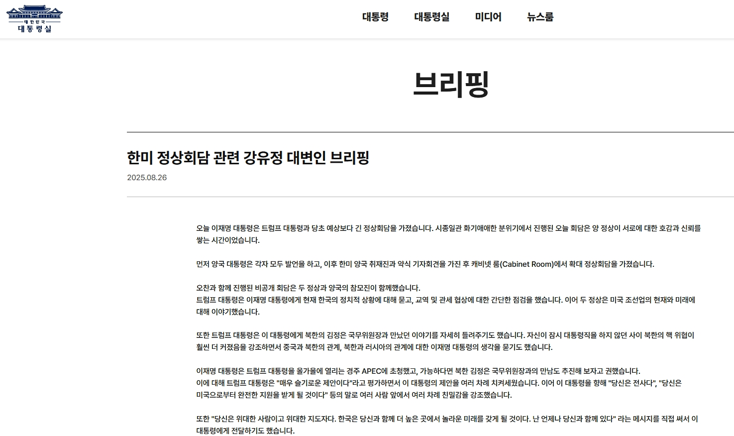 2025年8月26日本日、李在明大統領はトランプ大統領と当初の予想より長く首脳会談を行いました。