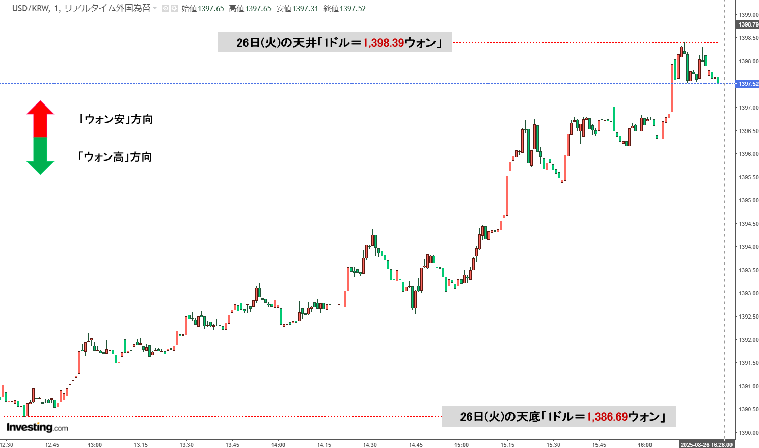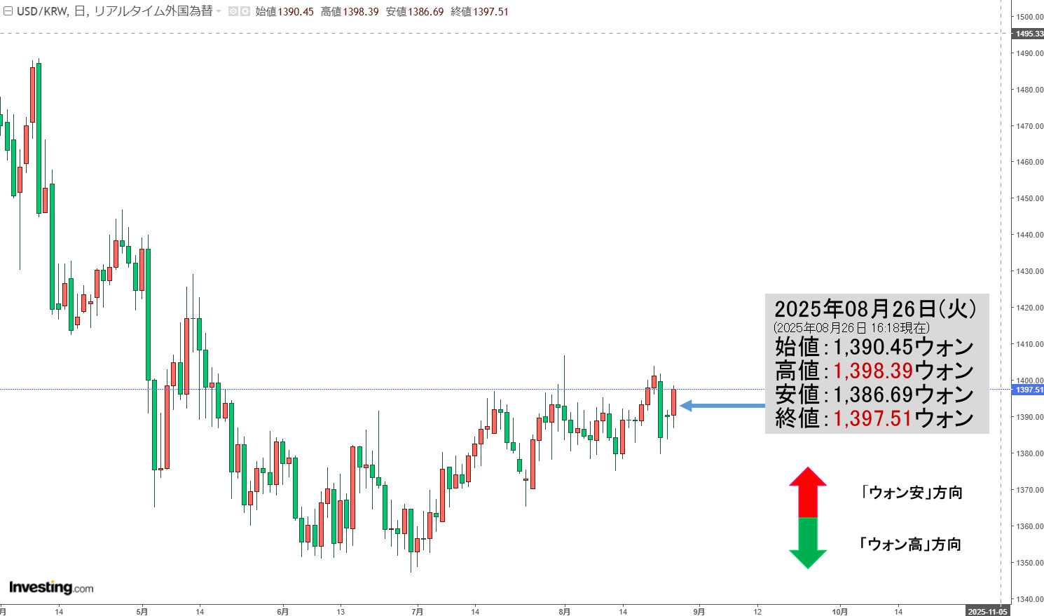 2025年08月27日(水)の市場が開きました。10:00現在、ドルウォンのチャートは以下のようになっています(チャートは『Investing.com』より引用)。これからローソク足の調整が入るでしょうが、「1ドル=1,390ウォン」超えで...