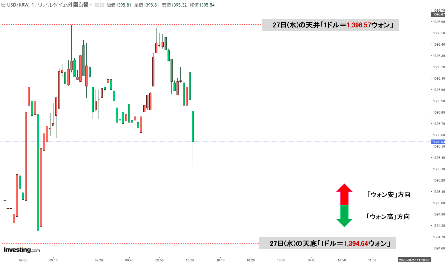 2025年08月27日(水)の市場が開きました。10:00現在、ドルウォンのチャートは以下のようになっています(チャートは『Investing.com』より引用)。
