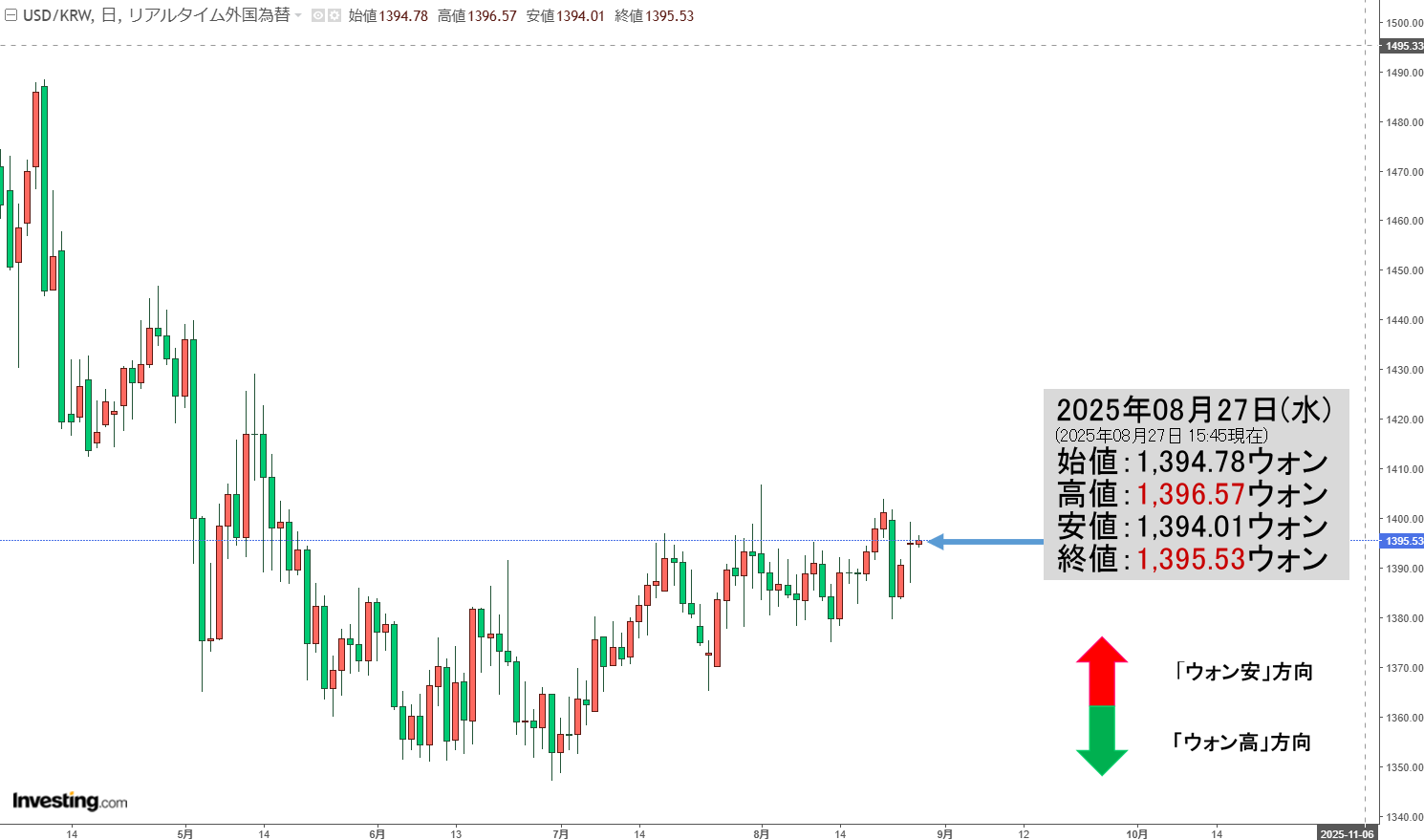 2025年08月27日(水)15:45現在、ドルウォンのチャートは以下のようになっています(チャートは『Investing.com』より引用)。