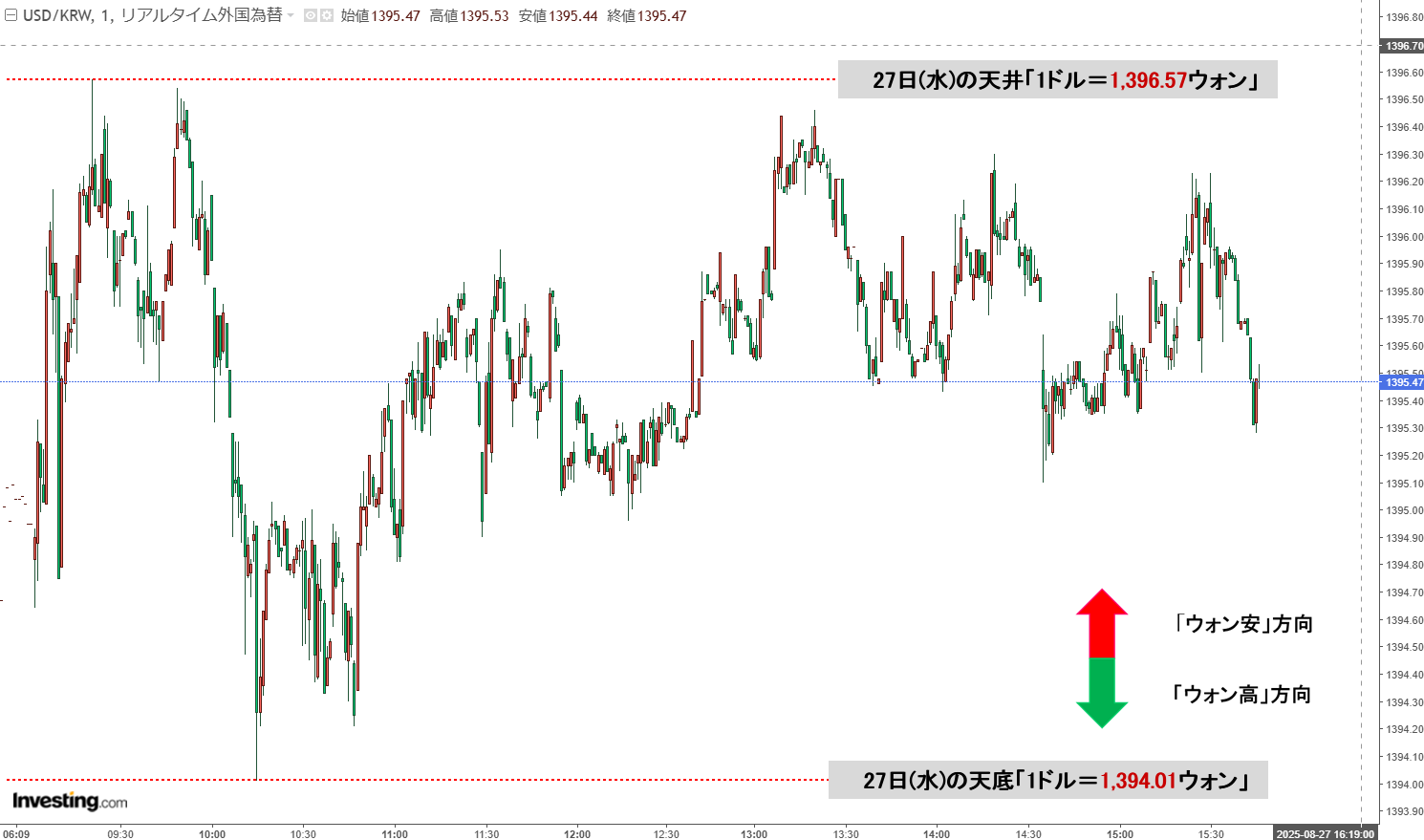 2025年08月28日(木)の市場が開きました。12:01現在、ドルウォンのチャートは以下のようになっています(チャートは『Investing.com』より引用)。陰線が伸びています。現在のところ「1ドル=1,388ウォン」近辺の攻防となっ...
