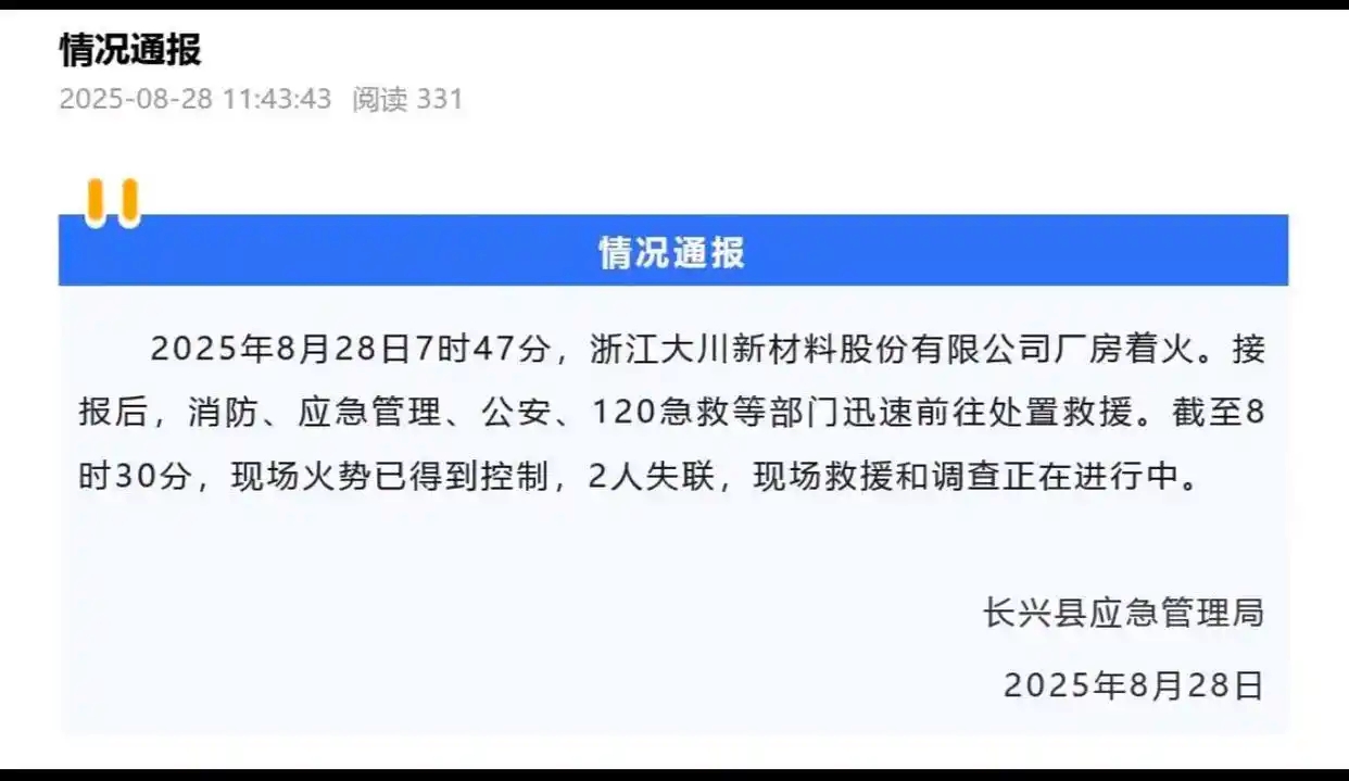 2025年08月28日午前7時47分、浙江大川新材料股份有限公司の工場建屋で火災が発生しました。